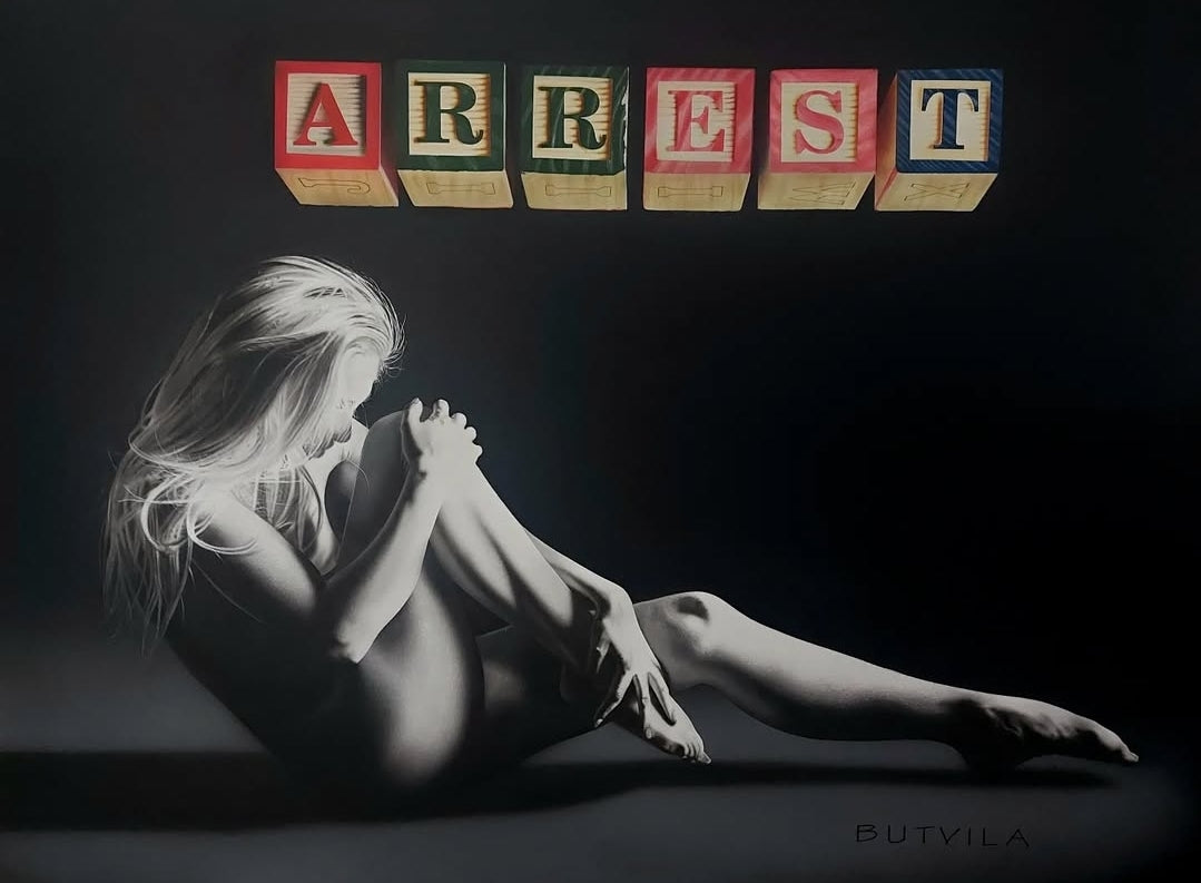 "Under Arrest" is a bold and thought-provoking painting that combines sensuality with wit. Featuring a naked woman reclining on her side beneath a line of dice spelling out "Arrest," this black-and-white artwork plays cleverly with words and imagery. Perfect for those who appreciate art that sparks conversation and challenges convention, this piece adds a touch of intrigue to any space.